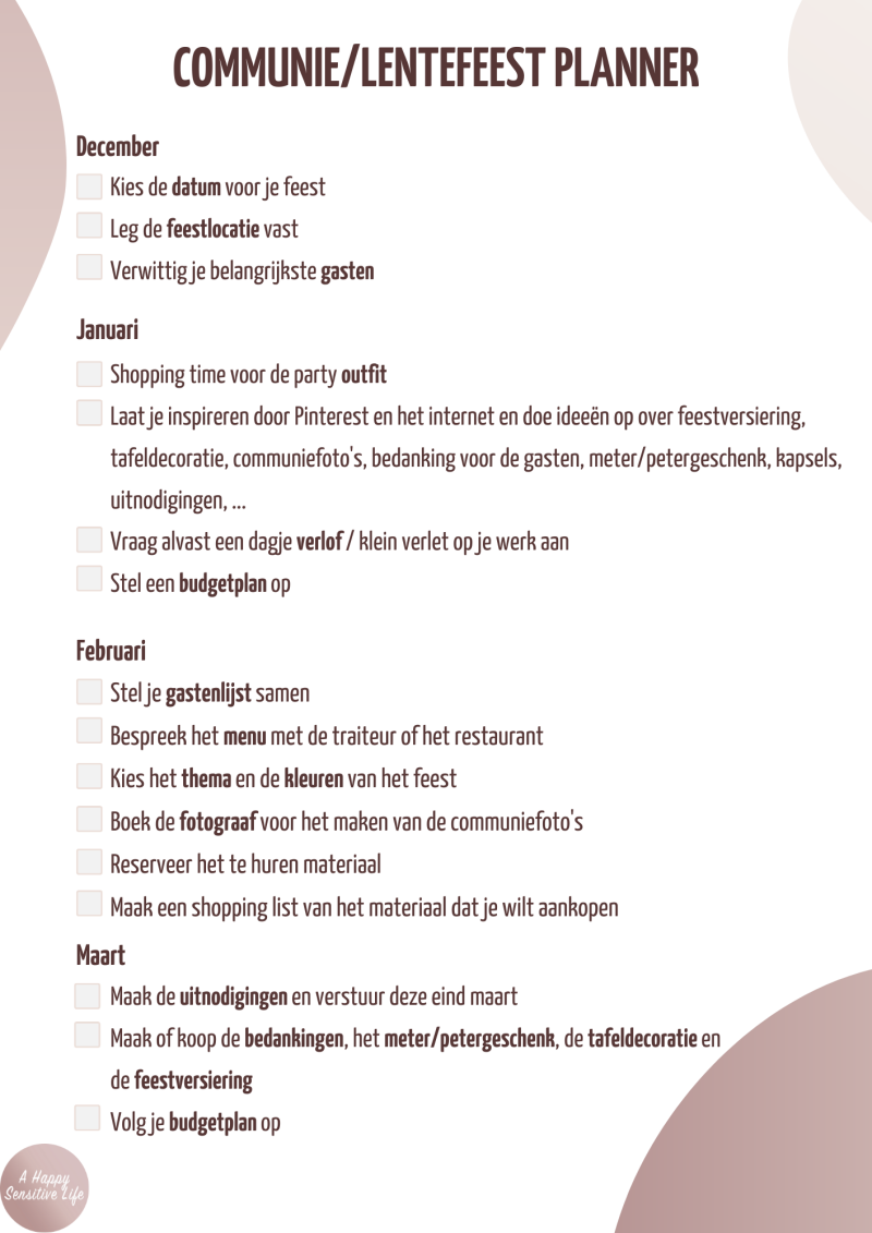 Het voorbereiden en organiseren van deze feestdag vergt toch enige planning en organisatie. Maar geen paniek! Ik maakte een communie/lentefeestplanner zodat je niks vergeet en straks relax van het feest kan genieten!